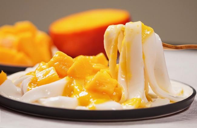 拌入芒果汁及芒果粒,即成